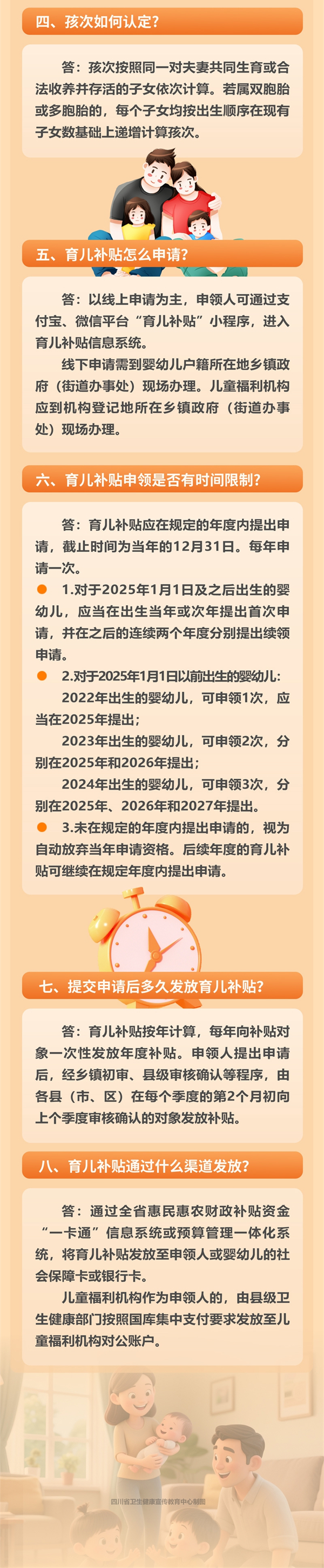 《四川省育儿补贴制度实施方案》原文 四川省卫生健康委员会 四川省财政厅 印发《四川省育儿补贴制度实施方案》 川卫发〔2025〕12号 近日,经省政府同意,四川省卫生健康委员会、四川省财政厅印发了《四川省育儿补贴制度实施方案》,主要内容如下: 一、补贴对象和标准 (一)补贴对象。从2025年1月1日起,对符合法律法规规定生育的3周岁以下婴幼儿发放补贴,至其年满3周岁。 (二)补贴标准。育儿补贴按年发放,现阶段执行国家基础标准为每孩每年3600元。其中,对2025年1月1日之前出生、不满3周岁的婴幼儿,按应补贴月数折算计发补贴。对按照育儿补贴制度规定发放的育儿补贴免征个人所得税。在最低生活保障对象、特困人员等救助对象认定时,育儿补贴不计入家庭或个人收入。 二、申领条件 符合补贴对象年龄、申领时限及下列情形的,可以申领育儿补贴: (一)符合法律法规规定生育的一孩、二孩、三孩; (二)有子女死亡,存活子女不满三个,符合法律法规规定再生育的子女; (三)已生育三个子女,有子女按规定鉴定为残疾,符合法律法规规定再生育的子女; (四)符合民族自治地方依法制定的现行计划生育具体办法生育的子女; (五)符合法律法规规定生育的子女为双胞胎或多胞胎的,每个子女均可享受; (六)符合法律法规规定收养的3周岁以下婴幼儿,以及3周岁以下的孤儿、事实无人抚养的婴幼儿。 孩次按照同一对夫妻共同生育或合法收养并存活的子女依次计算。若属双胞胎或多胞胎的,每个子女均按出生顺序在现有子女数基础上递增计算孩次。 三、申领程序 育儿补贴由婴幼儿父母一方或其他监护人按规定向婴幼儿户籍所在地申领,用于育儿相关支出。具体程序如下: (一)申请。申领人填写婴幼儿及申领人有关信息,提供婴幼儿的出生医学证明、户口簿等基础材料,并根据需要提供有助于判定申领人和婴幼儿之间抚养关系的法定有效材料,并对所提供信息及材料的真实性、完整性作出承诺。申领人主要通过育儿补贴信息管理系统线上申请,也可到婴幼儿户籍所在地乡镇政府(街道办事处)现场申请。申领人是儿童福利机构的,应到机构登记所在地乡镇政府(街道办事处)现场申请。 (二)初审。婴幼儿户籍所在地乡镇政府(街道办事处)对申请信息进行初审。符合条件的予以通过,并报县级卫生健康部门审核;不符合条件的,应当及时告知申领人并做好政策解释。村(居)民委员会协助做好有关工作。申领相关信息和材料的审核以申领人提交申请时的状态为准;发生修改的,以最后一次修改后提交时的状态为准。 (三)审核确认。县级卫生健康部门对乡镇政府(街道办事处)提交的申请材料进行审核,确认补贴发放对象名单,并将相关信息提供给同级财政部门。 初审和审核确认工作原则上应在30个工作日内完成。 审核工作要充分发挥大数据审核作用,申领人上传的材料作为备查,切实减轻基层负担。县乡对大数据审核存在不一致的,要进行重点核查。 (四)抽查。市级卫生健康部门每年按一定比例,对补贴对象信息进行抽查。省级卫生健康部门根据需要开展抽查,实行动态监管,确保资金安全。 四、申领时限 申领人按年度申请。申领人应当在婴幼儿出生当年或次年提出首次申请,并在之后的连续两个年度分别提出续领申请。 对于2025年1月1日以前出生的婴幼儿,首次申请应在2025年12月31日前提出。 续领时,相关申请信息、材料发生变更的,申领人应当及时更新。 逾期未提交申请的,视为自动放弃当年申请资格。 五、补贴发放 (一)补贴发放时间。育儿补贴按年计算,每年向补贴对象一次性发放年度补贴。各县(市、区)应在每个季度的第2个月初向上个季度审核确认的对象发放补贴,确保及时足额发放到位。 (二)补贴发放渠道。通过全省惠民惠农财政补贴资金“一卡通”信息系统或预算管理一体化系统,将育儿补贴发放至申领人或婴幼儿的社会保障卡或银行卡。儿童福利机构作为申领人的,由县级卫生健康部门按照国库集中支付要求发放至儿童福利机构对公账户。 六、管理和监督 (一)信息管理。省级卫生健康部门负责育儿补贴信息管理系统部署、运维和安全防护。各级卫生健康部门结合“出生一件事”联办,充分利用公安、民政、人力资源社会保障、卫生健康、残联等部门人口基础信息,进行信息共享比对,提高工作效率和精准性;定期开展数据监测统计、汇总分析等工作,为做好政策评估及调整优化提供支持。各级系统用户要严格落实信息安全责任,不得越权处理信息,不得擅自对外提供或发布相关信息。 (二)资金管理。各县(市、区)应建立对账机制,确保资金安全和及时足额发放到位。对于发放过程中出现的个人账户无法划转、账户错误、账户存疑等问题,县级卫生健康部门应会同财政部门核实处理,并及时将有关处理意见反馈申领人。 (三)全程监督。审计部门、财政部门要加强全过程监督检查。纪检监察机关要强化监督执纪问责,严肃查处损害群众利益的不正之风和腐败问题。卫生健康部门、财政部门要强化资金使用管理,加强对代理发放机构的监督,切实提高资金使用效益。省级卫生健康部门做好育儿补贴申领发放信息备份,市、县、乡级做好育儿补贴相关档案管理,认真受理群众申诉、举报,主动接受各方监督。 (四)责任追究。对实施虚报、隐瞒等非法手段骗取