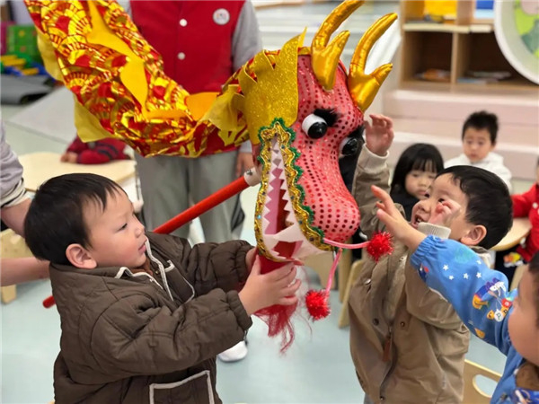 民俗游园·欢乐闹元宵 节日的氛围,在游戏中推向高潮。盛泰园的元宵游园会热闹非凡:孩子们专注地“钓元宵”,在“小马奔腾”与“飞机起飞”中活力奔跑,随后品尝自己的劳动成果,最后在妙趣横生的“猜灯谜”中启迪智慧。而在神仙树园,孩子们则近距离认识了象征吉祥的彩龙,通过触摸与聆听,感受传统民俗的魅力。