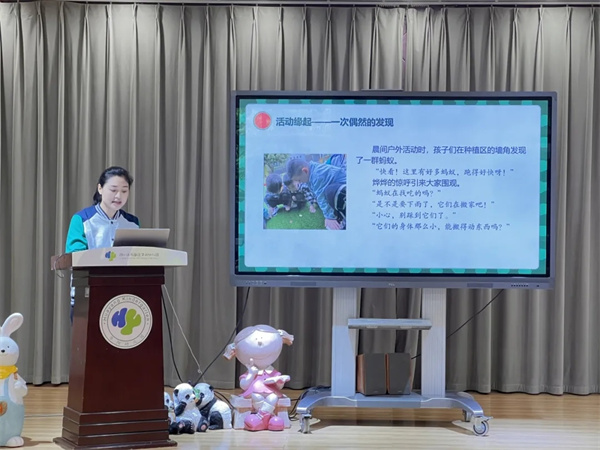 接下来,王欣和彭清萍两位教师分别以“蚂蚁搬西瓜”和“川剧变脸”两个生动有趣的案例,分享了华阳幼儿园在戏剧活动实践中的具体探索。案例中呈现了华阳幼儿园如何将戏剧活动有机融入日常教学,特别是在培养幼儿交往习惯方面的应用场景。通过情景模拟和角色扮演,幼儿在互动中学习合作、沟通与表达,初步展现了戏剧教育活动在促进幼儿社会性发展方面的积极成效。
