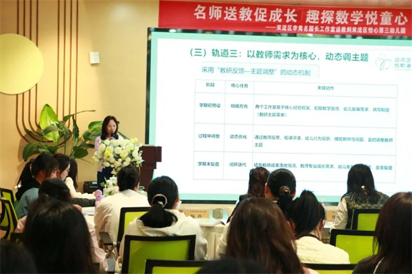 李隽名园长工作室成员、双流区西航港幼儿园樊锐副园长,以《深耕数学,从“教”的逻辑走向“学”的支持》为主题,详细分享西航港幼儿园支持幼儿数学核心经验发展的“三轨协调”教研体系:以核心经验确定教研序列,以学习路径设立专项教研组,以教师需求动态调整主题,为教师观察、教研赋能幼儿数学学习提供可借鉴的实践范例。
