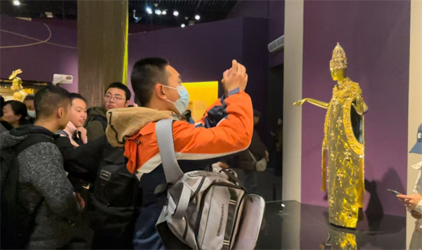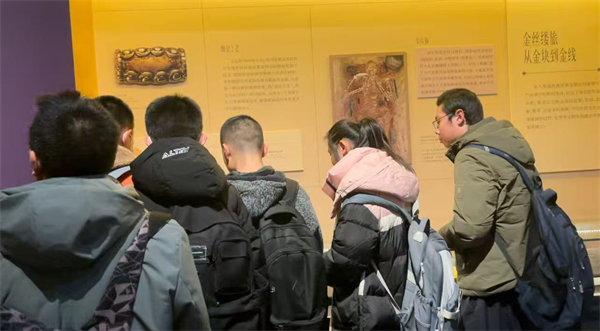此外,老师还紧扣社会主义核心价值观,引导孩子们探寻古代工匠敬业专注的精神与当代社会发展的内在关联,将思政教育的种子悄然播撒在孩子们心中。 展厅参观:沉浸体验 文化铸魂 一进展厅,孩子们便被精美的金线织物深深吸引,纷纷驻足观赏。随着讲解员的生动讲述,他们神情专注地聆听,不时轻声交流心中感悟。在近距离端详中,古代工匠的精湛技艺与劳动智慧扑面而来,孩子们也深刻领略到中华优秀传统文化的博大精深。老师们适时上前引导,让孩子们明白:这些金线织物不仅是巧夺天工的艺术品,更是民族文化传承的重要载体,承载着中华民族独特的审美情趣与精神追求,而守护这份历史与艺术之美,正需要每个人用文明的言行去践行。