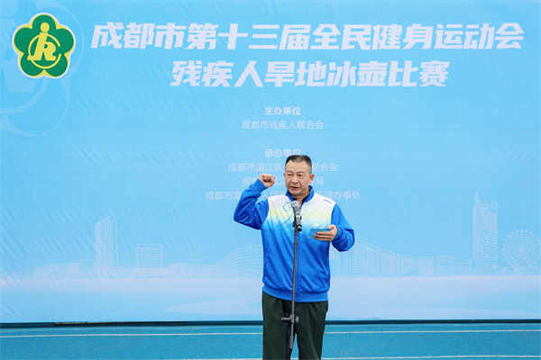 成都市残疾人联合会党组成员、副理事长赵小明宣布成都市第十三届全民健身运动会残疾人旱地冰壶比赛开幕。