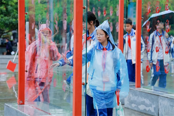这场活动不仅是一次趣味满满的团队挑战,更是一堂深刻的红色团结教育课。 以手印铭史·承英雄薪火 研学途中,新城学子们来到抗战老兵手印广场,开启与历史对话、与英雄同行的精神洗礼。广场上,数千枚老兵手印整齐排列,震撼人心。每一道凹凸的掌纹,都是浴血奋战的峥嵘岁月,都是民族英雄的鲜活见证。也正是这一双双英雄之手,撑起民族脊梁,换来今日和平。