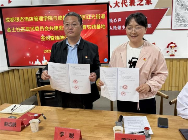 随后,马克思主义学院副院长李聪代表成都银杏酒店管理学院,与金土社区党委书记廖飞宇共同签署共建协议。签约完成后,双方代表共同为实践基地挂牌,标志着成都银杏酒店管理学院与金土社区思想政治教育实践基地正式落地。