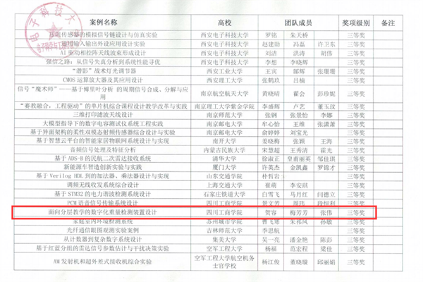 近日,由教育部高等学校电子信息类专业教学指导委员会、国家级实验教学示范中心联席会电子学科组和中国电子教育学会联合主办的第五届全国高校电子信息类专业课程实验教学案例设计竞赛(RIGOL杯)全国总决赛在电子科技大学圆满落幕。本次竞赛汇聚了全国四大赛区的优秀教师同台竞技,旨在推动探究性、创新性实验教学改革,提升教师实践教学水平。经过激烈角逐,四川工商学院教师团队表现优异,凭借卓越的教学设计能力,最终斩获全国二等奖一项、三等奖一项,展现了学校在跨学科实验教学领域的创新活力与扎实功底。