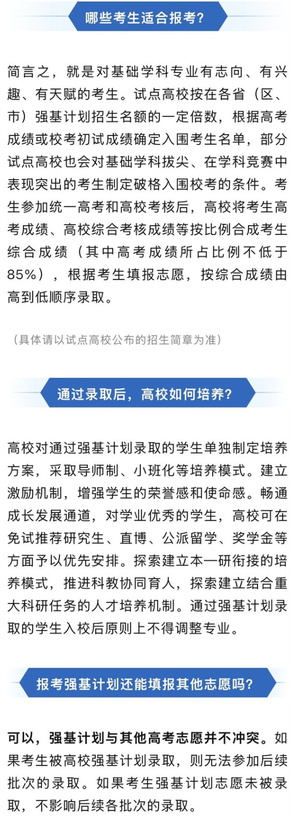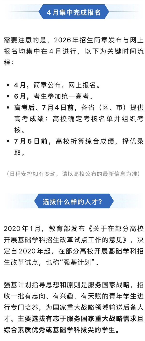 随着试点高校陆续发布“强基计划”招生简章,2026年“强基计划”招生工作陆续启动,网上报名于4月全面展开。“强基计划”自2020年启动实施以来,持续推进基础学科拔尖创新人才,选拔培养机制的建立健全,每年数千名学子通过强基计划进入心仪高校。哪些考生适合报考强基计划?今年报考流程是怎样的?报考强基计划是否影响其他志愿填报?一起来看。