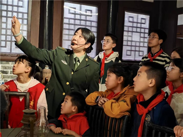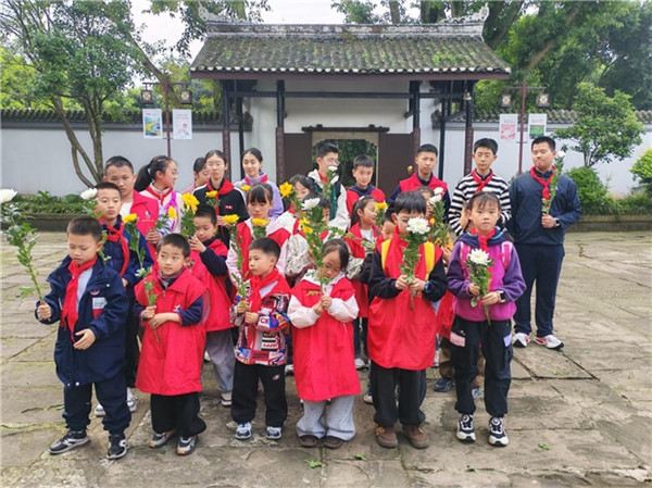 参观结束后,缅怀仪式在陈列馆前庄重举行。全体人员肃立默哀一分钟,向革命先辈表达深切缅怀与崇高敬意。随后,少先队员代表向朱德同志塑像敬献鲜花。在鲜艳的队旗下,全体少先队员高举右拳,重温入队誓词:“我是中国少年先锋队队员……准备着,为共产主义事业贡献力量!”铿锵誓言回荡在陈列馆上空,展现了新时代青少年继承先烈遗志、奋发向上的精神风貌。 活动最后,孩子们化身“文明祭祀宣传员”,在连云社区周边开展志愿服务向居民发放文明祭祀倡议书,倡导鲜花祭扫、网络祭扫等绿色环保方式,用实际行动传递文明新风。