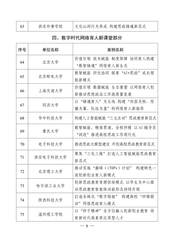 首批100个典型案例对标新时代立德树人工程布局,包括立德树人机制综合改革、党的创新理论主课堂、新时代伟大变革实践育人大课堂、数字时代网络育人新课堂、教师队伍和基层组织建设等5部分,系统涵盖思政工作相关体制机制、平台载体、队伍支撑、协同保障、评价反馈等各方面。 下一步,教育部将组织开展典型案例培训推广工作,指导各地各校结合立德树人机制综合改革持续深化对典型案例的总结提炼、完善提升和宣传推介,加强和改进学校思想政治工作,不断提升立德树人效能。 |