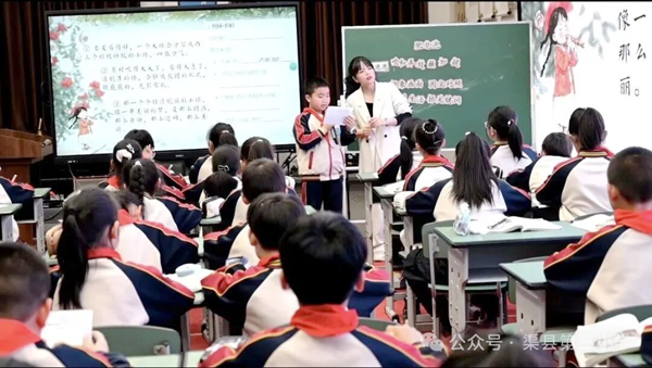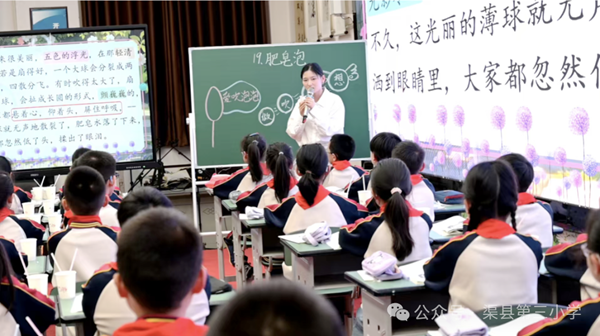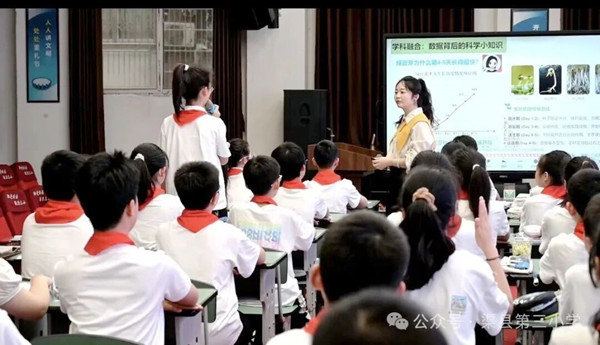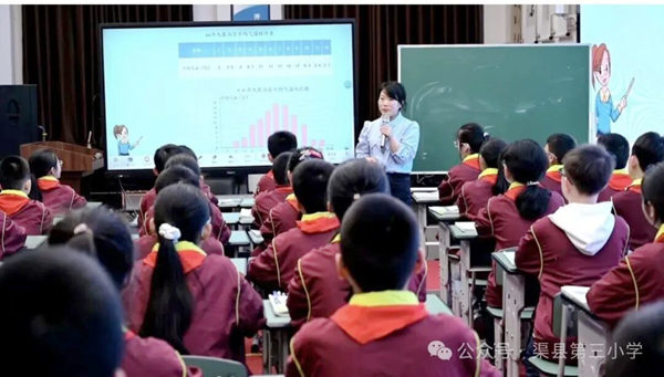 整场讲座既有前沿理论高度,又有务实实践指导,为各校后续将AI技术融入日常教学、推动数字化转型理清了思路。 下午的同课异构展示环节,4位教师围绕“融合课程”主题呈现了4节风格迥异、亮点纷呈的示范课。 在语文+劳动融合课《肥皂泡泡》环节,渠县龙凤镇中心学校的汤诗宇老师以“趣”为核心,通过动手实践引导学生梳理吹肥皂泡流程,落实语言表达训练,实现读写结合。渠县第三小学的廖丹丹老师则创意引入AI数字人“遇见冰心”,以闯关任务驱动学习,将科技赋能与语文味自然融合。 在数学+科学融合课环节,渠县合力镇第一学校的郑霖老师以“用折线统计图研究热传递规律”为主题,让学生亲手采集数据、绘制图表,培养科学探究思维。渠县第三小学的万柳含老师以“读懂生命生长的轨迹”为核心线索,从绿豆芽生长数据入手,融合科学探究、健康教育与思政元素,让学生在掌握统计技能的同时感受数学工具的人文温度。