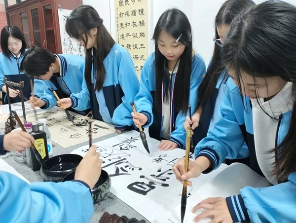 参观结束,同学们走进文创体验室,现场体验书法创作。大家手持毛笔,从握笔、运笔学起,在宣纸上挥毫泼墨,沉浸式感受书法艺术的独特韵味,现场墨香四溢、氛围热烈。张艺寄语全体同学,鼓励大家以此次研学为契机,热爱传统文化、庚经典文脉。