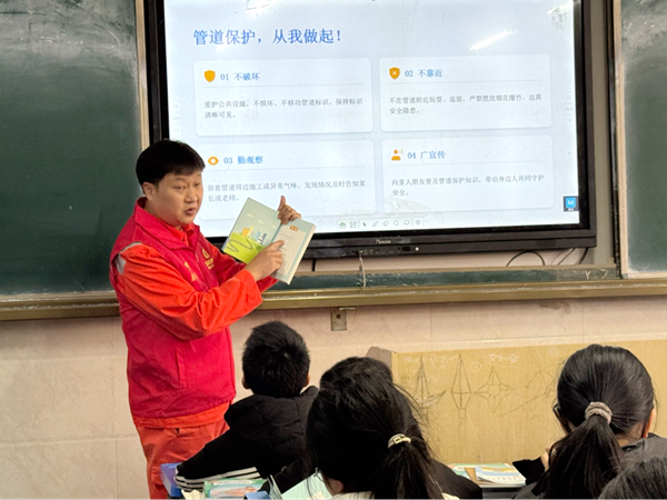 活动中,来自兰成渝输油分公司的宣讲员以通俗易懂的语言、生动鲜活的案例,向八年级1班全体同学系统讲解长输天然气管道的重要作用、保护意义、安全警示标识识别、管道周边禁止行为,以及发现管道异常时的正确报告与避险方法。宣讲员结合生活场景,通过问答互动、案例解析等形式,让同学们深刻认识到保护能源管道就是守护公共安全,引导大家争当“管道保护小卫士”,把安全知识带回家、讲给家人听,以“教育一个学生、带动一个家庭、影响一片区域”的方式,共筑管道安全防线。