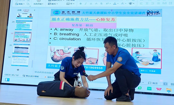 活动现场,大竹蓝天救援队讲师围绕“溺水正确施救方法”展开讲解。从利用绳索、竹杆、树枝等工具实施岸上救援,到演示“钟摆式”等科学抛拉技巧,讲师结合图文案例,清晰阐释错误救援方式的危害,传授高效、安全的施救要点,让同学们对防溺水救援有了基础认知。