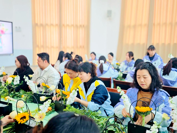 活动现场花香四溢,气氛温馨。专业花艺老师首先为大家讲解了花卉种类、色彩搭配及造型技巧。在老师的指导下,平日里辛勤耕耘的“园丁”们变身优雅的“花艺师”,大家发挥创意,用心选材、修剪枝叶、搭配色彩,将一朵朵普通的鲜花,经过巧手修枝剪叶、搭配色彩,变成了一篮篮错落有致、独具匠心的插花作品。